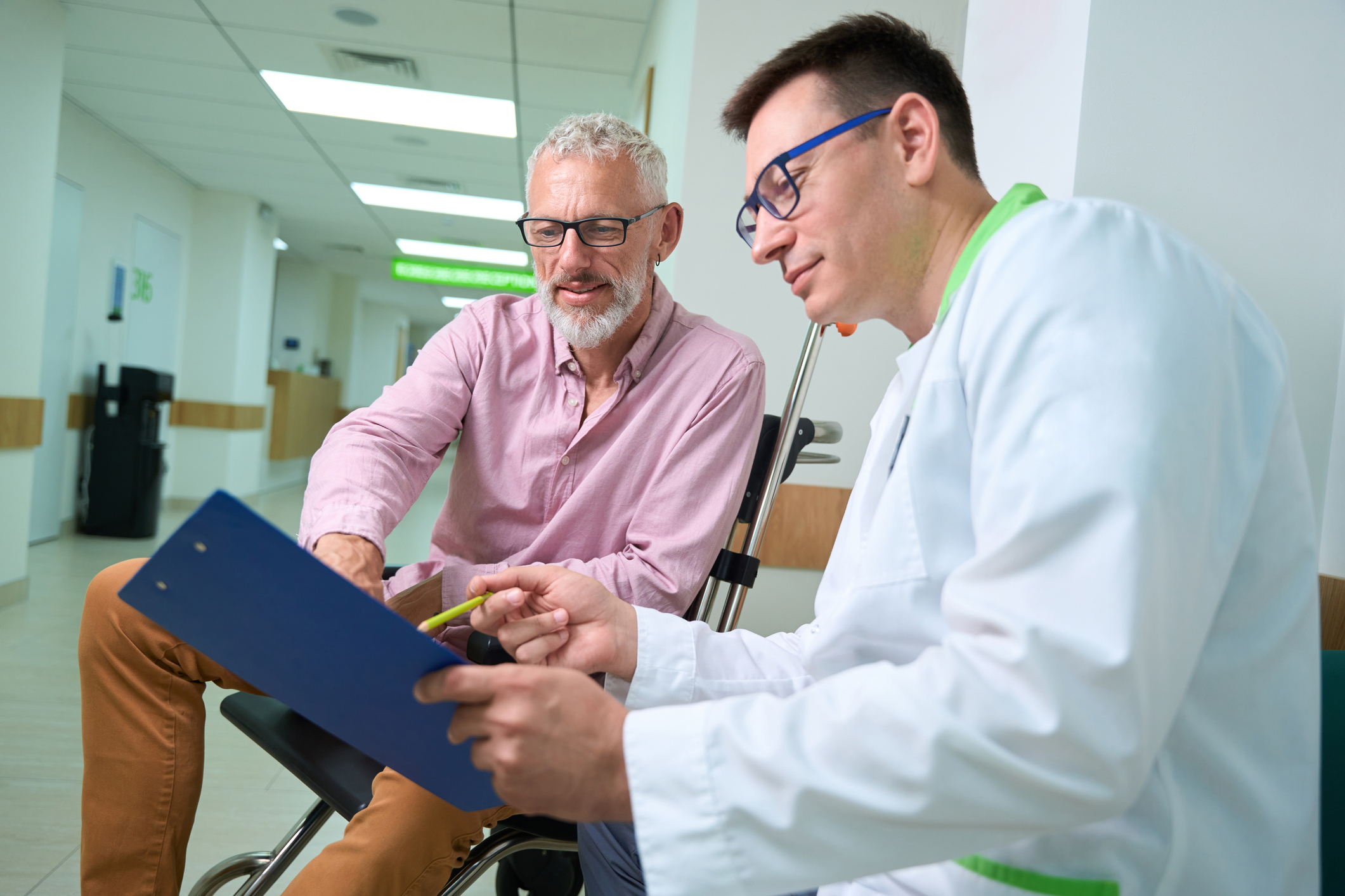Doctor in a medical gown conducts a survey of a patient, a man sits in a wheelchair